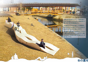 | 堀川運河は人と人をつなぐ媒介。もう1つの運河を杉で提案。どこまでもおだやかに揺らめく水面と「杉の運河」がシンクロして美しい風景をつくりだす。使い方も自由で、おおらかに受け止めるデザイン。 | |||||||||||||