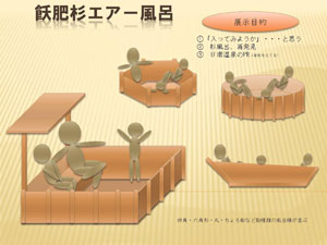 | エアギター、とは有名ですが、ここではエアー風呂です。オープンエアーでエアー風呂、ということですね。飫肥杉の特性を生かし、色々な形を提案しています。 | |||||||||||||