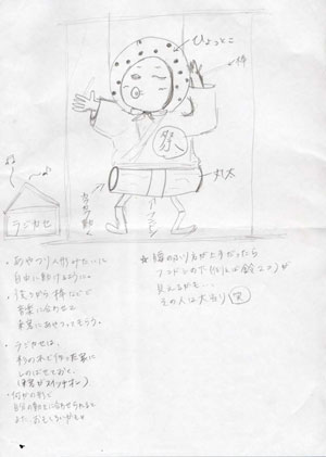 | ひょっとこのお面をつけたあやつり人形。広場に来た人が、自由に後の棒で操る。杉でつくった小さな家にラジカセが忍ばせてある。 | |||||||||||||