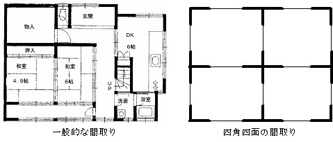 | なぜ床が剛である方が良いかというと、木造住宅を構成する耐力壁が、偏って配置されている場合においては、大きな地震力や風圧力を受けた時、ねじれが生じ倒壊の危険性が高くなる。 しかし、耐力壁がバランスよく配置されている(偏芯率 0.15以下の)住宅では、特別に剛床とする必要はなく、柔らかい床としてもよいが、意匠計画上、四角四面の住宅はメーカーの企画住宅以外では非常に少ないといえ、一般的に住宅の間取り等の平面計画は敷地条件等により決まったり、また生活スタイルで決定されることが多く、それらの要素を含めて多様なプランで構成されているのが現状である。(図−1) |