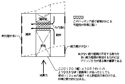 | さらに、もう一つの安全上の注意点として、階段・吹抜けによる水平構面の開口部の問題がある。 なぜ水平構面における開口部が問題かというと、開口部を除いた部分で力を伝達しなければならず、伝達経路のブリッジ(床面)や接合部に大きな力がかかり、破壊がおこる可能性が非常に高いからである。(図―3) |