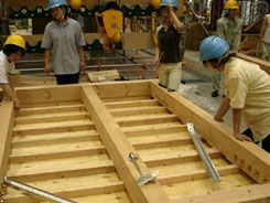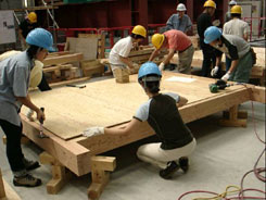 | 写真−1 通常の2階建て住宅によく使用されている「合板転ばし根太+火打ち仕様」の実験を行なうための試験体製作もセミナー生及び高専生と協力の上行なった。 |
