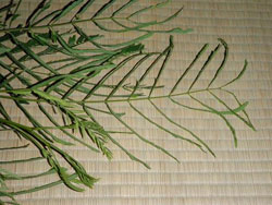 | さて、薬用としては、7〜8月の夏季に集めた樹皮を天日乾燥したものを合歓皮といい、利尿、強壮、鎮痛、駆虫、健胃に煎じたものを服用して使います。また、煎じたものは動物実験によって陣痛促進作用があることが知られています。 合歓皮を黒焼きにしたものとキハダ(オウバク)の粉末を2:8で混ぜ酢でよく練ったものを冷湿布とすると効果があるとのことです。また、ネムノキの花(合歓花)を乾燥し、煎じて飲めば脚気に効くとされています。 葉や若葉にはそれぞれクエルシトリン、ビタミンCなどが含まれ、ゆでて食用にしたり、牛馬の餌としました。よくマメ科の植物は家畜の餌にしましたので、子供の頃クズの葉を取る手伝いをしたことがあるかたも居られるのではないでしょうか? 葉を乾燥させ粉末状にしたものは抹香の代用として山村では利用されました。 |