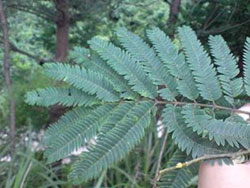 | 写真のように、全く違う種類の植物のようになっています。小葉だけが閉じ、他はそのままになっています。 なお、葉が似ていて、さわると一瞬で葉が閉じるオジギソウも同じマメ科ですが、オジギソウは最初の刺激では葉を閉じ、さらに刺激すると葉柄の付け根からぐにゃりと曲がってしまいます。どういう進化を遂げてそのような性質を獲得したのか、大変興味がわいてきますが、まだ全貌解明には至っていないようです。 |