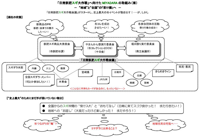 | 企画当初は、毎年、日南油津で開催されている地域のイベント「堀川まつり」に 「やまんかん祭り/杉コレクション2009in日南」と 「飫肥杉商品大発表会」との同時開催だった。 この三本柱の連絡調整組織として「大作戦会議」が設置され、準備がスタートした。 今年の4月末のことである。 ミヤダラは、まだ立ち位置が定まらず、サポート役に回っていた。 しかし当然の事ながら、「大作戦会議」では、各自のイベント準備だけで手一杯状態。 本来の「大作戦」の意義から一過性のイベントになりそうな気配が強まりつつあった。 つまり、エンドユーザー(住民)不在のまま、イベントだけが先行しようとしていた。 |