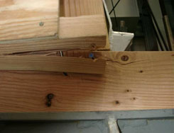 梁に止めつけられた根太の斜め釘打ち部分で、ねじれによる大きな割裂破壊が生じた。 |