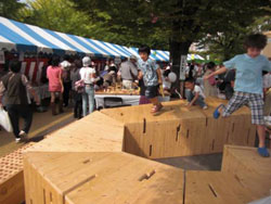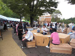 | 東京の木場公園で行われる「木と暮らしのふれあい展」に参加してもう5年になる。この事業の当初の目的は、東京、首都圏での足がかり作りだった。海杉は、5年連続の参加だ。 「宮崎名物 鶏の炭火焼は、いかがですか!!」と大きな声で威勢良く売る。今年は、1日目が雨で人出が少なく、目標の30kgが15kgしか売れなくて、焦ってしまった。この売り上げが、杉コレの作品の運送費に当てられるのだ。売れなければ、自腹で運ばなければならない。 |