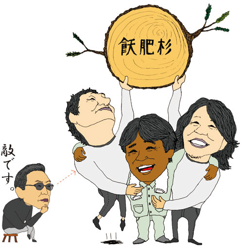 登場してくる四名を思い浮かんだまま描きました。プロジェクトの写真や若杉さんたちの話を聞いていると松山さんや飫肥杉課の皆様に会いたくなりました。 |