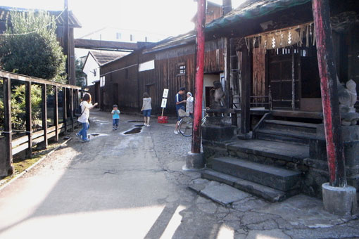 次に醤油蔵「越のむらさき」へ。ここでは蔵の見学会を行っていたので、醤油の行程を一通り案内して貰う。気さくな女性が元気に説明してくれ、とても分かりやすかった。震災で傷んだ建物もそうであるが、古い道具や機械をだましだまし大事に使いながら、つくる人の感覚を大事にしながらつくっている姿勢にある種今失われつつあるものづくりの本質を感じた。 米や大豆や麦などを原料を発酵させ、出来て来るものは酒や味噌や醤油とさまざまだ。それぞれの蔵がスケールや個性が違うものの、地区に漂う独特の臭いや、麹菌で黒くなった外壁などが微妙に相互に絡み合い、この地独特の雰囲気を漂わせている。とても魅力的な場所だ。 だが、建物の老朽化や世代交代も問題も含め、岐路に立たされている。 |