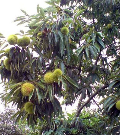 | クリは古来からその実を食用に利用してきました。古事記にもすでに現れており、万葉集などでも詠まれています。クリの実は野生のものは小さく、ヤマグリ・シバグリと呼ばれていますが、甘味は栽培種より強いとされます。 縄文時代の遺跡からも栗塚などが見つかっており、時代を経るにしたがって実が大きくなっています。これは縄文時代の人々がクリ栽培を行い、大粒の実ができるよう選抜を続けた結果です。 さて、現在栽培されているものは20種前後となっておりますが、栽培種は自生シバグリの中から選抜育成されたもの、シナグリの優良種や、日本産と中国産の交雑種などでしたが、昭和23年頃に発生したクリタマバチ(後述)のため従来の早生・中生系統の品種が大きな被害を受け消滅してしまいました。現在栽培されている品種はクリタマバチ抵抗性がある品種です。 |