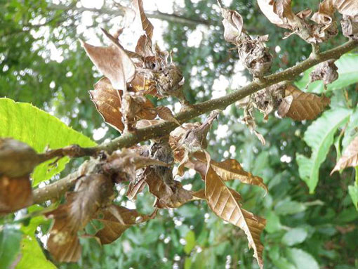 | クリタマバチの寄生を受けたクリの枝。実もならず、葉がしおれて全体的に弱っていました。(平成21年10月6日撮影) | |||||||||||||||||||||