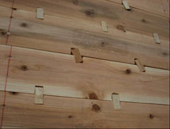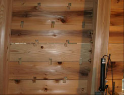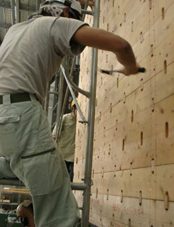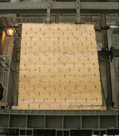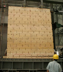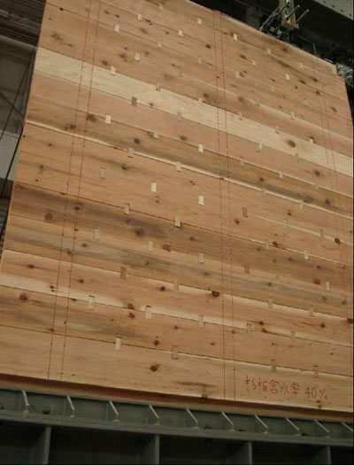 | 写真8 最大ストローク時の全体変形状況(1/18rad{max}時) 2枚ごとに杉厚板が大きくずれているのがわかる。 ずれている所のダボの数量は一列に4個のダボが設置されている箇所である。(上図参照) |