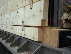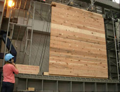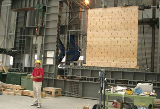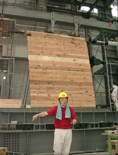 | 写真2 実験前全体状況 試験体は1週間前に製作したものであるが、試験当日の状況は乾燥により材が収縮し、厚板間の隙間が見られた。 |