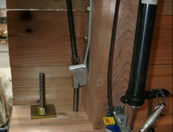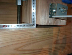 | 写真12 桧厚板浮き上がり状況(1/100rad時) 同上によるHD金物の降伏による伸びで、桧厚板の脚部のみが浮き上がった。しかし、上部の板にはズレ及び浮き上がり等は見られなかった。 |