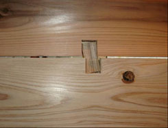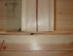 写真7 せん断抵抗ダボめり込み状況 (1/18rad{max}時) 4個配置のダボのめり込みと、杉板のめり込みの詳細状況で、ダボの堅木が板にめり込んでいるのがわかる。 |