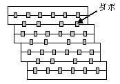 | 写真1 実験前全体状況 試験体は写真の通り、ダボが4個の配置と6個の配置と交互に設置した。 そこでダボが4個の配置と6個の配置では、どの程度ダボのめり込みに差が出るかを実験することとした。 |