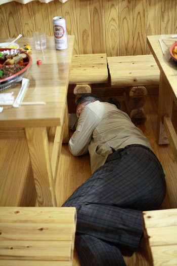 | 杉コレ最終審査の前日深夜、連日、各所で奔走した海杉さんを激写。本当にお疲れさまです。 海杉さん、写真掲載お許しください。(月刊杉編集部) |