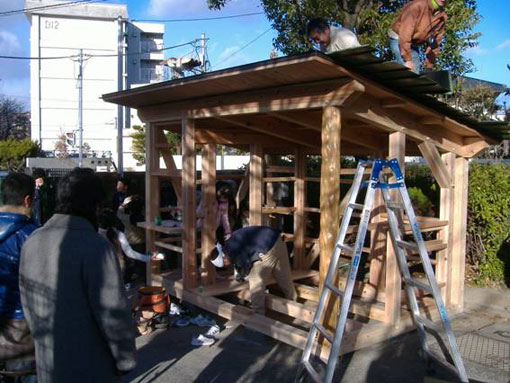 | 山と街が力を合わせて、佐竹台小学校の子供大工さんと一緒に、がんばって建築中です! 2010年2月14日の完成除幕式に向けて、ラストスパート中!。次号でたっぷりレポートさせて頂きます! |