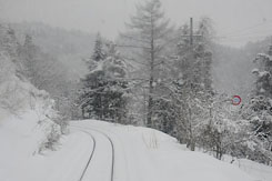 気温は下がり、手が悴んでくる。これからの事を考え、売店で手袋を買う。 そしてJR飯山線に乗り換える。飯山線は長野駅と新潟県の川口駅を結ぶローカル線で、戸隠や信濃平、野沢温泉といった長野県側のスキー場エリアを通り、新潟県に入ると越後妻有トリエンナーレで知られる中里、十日町へと通じる。雪のなかを走る単線は風情があるとも言えるが、なんともいえない寂しさもまた感じる。 |