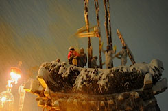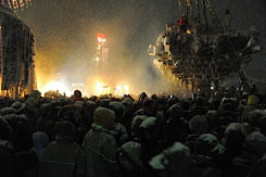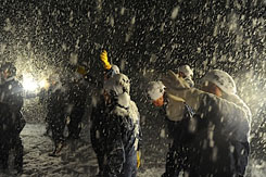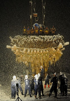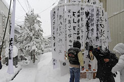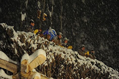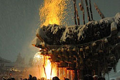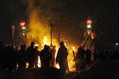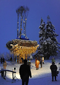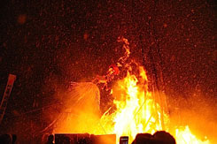 | そうとう雪が降っているが、観客はじっとしている。 | 上の男集松明の材料、オンガラを下に投げ落とす。 | |||||||||||||||