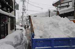 | 後で祭り会場に移動する初灯籠の下部。 | 雪の捨て場がなくトラックで雪を運んでいた。 |