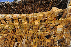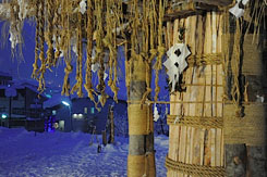 構造的には四本のご神木(通し柱)を組み、それに屋根にあたる部分は丸太を交互に七段に積み上げてあり、その上に雑木が積み上げられている。結して簡易なものではなく、ご神木に巻いてある縄の巻き方を見ても、かなりの熟練した技術と時間がかかっている事が想像出来る。 |