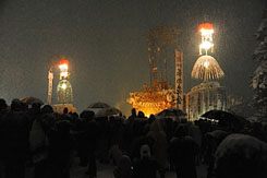 そもそも野沢の火祭りとは何か? 正確には野沢温泉道祖神祭りといい、日本三大火祭りに数えられ、国の重要無形文化財にもなっている。よくいう「どんど焼き」の大型版であるが、前年に誕生した子供の健康祈願、そして良縁祈願、男の厄年お祓いが中心だ。ただ、実は忙しさもあって、無謀にもほとんど予備知識無しで行ったのであった。だから、村の外れの会場に向かう道を歩きながら、そこにどんな光景が洗われるか、興味深々であった。 そこにあったものは、想像以上に美しい社殿であった。屋根の上には天まで届きそうに木が突き抜けている。 真っ白な背景に静かに、力強く、そして神秘的なでかつ原始的ともいえる空気を発している。 夕暮れの中に、スポットライトに浮かび上がった社幻想的だ。 すげ〜、 しばらく見とれてしまう。 |