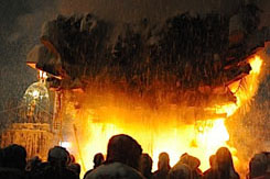 | 火祭りのスタート。初灯籠が彩りを添える。 | 火の攻防。結構激しい。 | |||||||||||||||