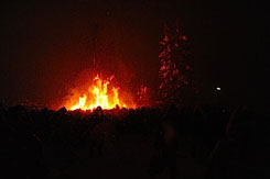 完全に焼け落ちるまで2時間近く掛かったろうか。今年は雪で木が湿っていたために燃えが悪く時間が掛かったらしい。その間、観客はほとんど動かない。頭に雪が積もりっぱなしだ。もうだめだ。寒さが限界に達し、足が凍り付きそうで、宿に帰った。大湯の近くの居酒屋で皆川さんと再び野沢菜と熱燗で暖をとる。 |