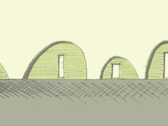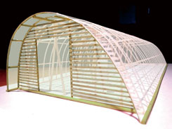 | 各円弧材は、割竹を腹合わせで2重に重ねたものを用います。まず、一重目のモウソウチク割竹を、仮円弧材に目視で合わせながら3本継ぎで円弧状に成形し、それぞれ50cm間隔に取り付けていきます。このときはまだ円弧面がきれいに見えませんが,、2重目の割竹を取り付けていくと、自然にしっかりとしたきれいな円弧面ができあがります。このあと、妻側の竹材を設置し、市販のビニールシートを張り架ければバンブーグリーンハウスが完成します。 | |||||||||||||
