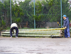 計画規模から必要本数を算出し、4.0m長のモウソウチク(直径10cm程度)約80本、4.0m長のマダケ(直径5cm程度)約40本を、集落裏山の竹林から伐採・搬出しました。資材確認の後、建設に向けた協議を地元住民の方々とおこないました。 |