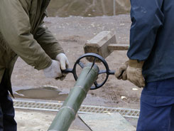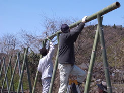 | 地面に打ち込んだ焼き丸太にモウソウチクを差し込んでいく | 支柱交差部に寸切りボルトを差し込み固定する | ||||||||||||
