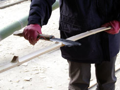| バンブーグリーンハウスの外皮となる円弧状部材として、割巾5cm程度のモウソウチク割竹をつくります。間伐伐採してきた竹材は材径が均一ではないので、五割用・六割用竹割器を適宜使い分けました。また、手作業で効率的に割竹をつくるために、モウソウチクの材長は4mとしています。割竹は円弧面をきれいに見せるため、さらに節目をナタで削り取ります。 | |||||||||||||