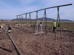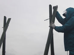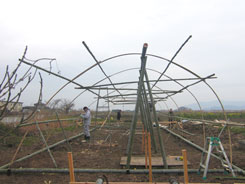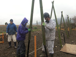 | 地面に打ち込んだ焼き丸太に、モウソウチク丸竹を各々差し込んでいき、頂部交差点に寸切りボルトを通して固定し自立させます。三角形の支柱は、構造体の背骨となり栽培利用時には通路空間となります。 | |||||||||||||
