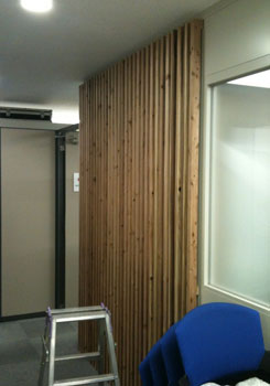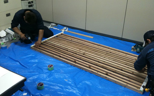 | 施工当日、家具関係は置き換えて行くだけなので、まずは周辺のスギダラインテリアの施工を行う。 杉材をリブ状にしたパネルで木の表情を立体的につくっていくのであるが、建具的にきっちりとした作り方ではなく、現場ですのこ状に組んだパネルをオフィスを仕切っているスチール製のパーティションにもみ込んで行くという簡易な方法を取った。 普段はスチール製の家具の組み立てばかりやっている職人さんたちは勝手の違う工事に戸惑うこともなく、楽しんでやってくれた。 |