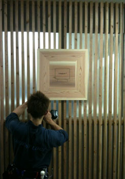 | 組みあがったリブパネルをスチールパーティションに固定。だんだんスギダラ化してきた。 | 社名看板を取り付け。リブパネルにビスが見えないように固定したのであるが、これが後の誤算となる。 | |||||||||||||||