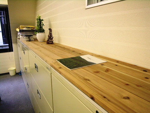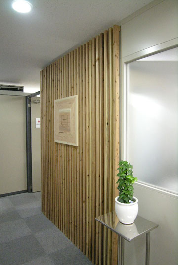 | お話を伺うと、毛利さんは特別に木を愛好されているわけでもなく、専門家でもない。一方、ご自身はNPOの活動で稲の栽培をしたりされていて、香りのするものが好きとの事。それで、今回事務所の模様替えの機会を得た時にふとその1年前の杉の香りの記憶が蘇り、若杉氏にコンタクトを取ったそうである。 久しぶりにスギダラ本部を訪問していただいた折に千代田も紹介を受け、スギダラ化計画に参画させていただくことにした。 |