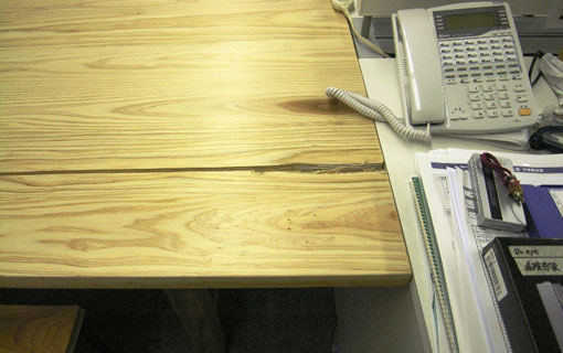 | できあがって2週間ほどしてから訪問させていただき、お話を伺ったのであるが、実はその間に思ってもみない不具合も出てきていた。 まずは、SUGIKARAテーブルの天板の割れ。これは自然に割れたものではなく、搬送中の落下等が原因だと思われる。天板の一部が砕けていて、そこから大きな割れが発生していた。もちろん、これは交換すべく手配をかけている。 |