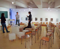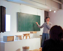 | 前日ほど荒れた感じではないものの、この日も雨。そして寒い。 朝10時に萩原さん、すぎっちと会場へ集合、展示の配置換えを行いました。 前日のフリートーク仕様から一変です。基本的には自由が丘での展示スタイル。 中央の高さ30cm程の台にミラーコートのコンセプト説明パネルを配置。 ユイスに座ると銭湯の鏡にそれぞれのコンセプトが書かれているといったイメージです。 |