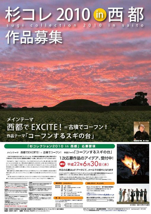 | メインテーマは「西都でEXCITE!=古墳でコーフン!」、作品テーマは「コーフンするスギの台」です。このテーマからどんな作品が出てくるのか??月刊杉では、今年も第1次審査、第2次審査、そして西都で行われる最終審査と、杉コレの経過をレポートしていく予定です。 | |||||||||||||