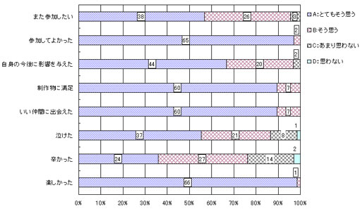 | 具体的な成果や影響については、2006年度の参加者にアンケートをとった。結果、学生参加者72名中、67名の回答で内容は表の通り活動に関する感想8項目の抜粋である。とりわけ、‘辛かった’において「とてもそう思う」「そう思う」の合計が約75%でその他の‘また参加したい’‘自分の今後に影響を与えた’等の項目においても「とてもそう思う」と答えた学生は半数以上に及ぶ。これらから「辛いけれど参加者の今後に影響を与え、また参加しよう」といった積極性が読み取れる。 | |||||||||||||