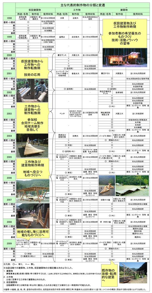 | 村内には27の地区があり、毎年できる限り異なる地区に制作拠点を置くように活動を実施している。初期の活動(1998〜1999)では仮設建築物や工作物の制作で、中期前半(2000〜2001)は仮設建築物から工作物へと転換し、中期後半(2002〜2003)は工作物から建築物へ移行、後期(2004〜2007)には工作物及び建築物となった。以降、現在までは過去製作物のメンテナンスや改修工事、地域住民や来訪者により近いものづくりをしている。このように技術を蓄積、応用して各参加校で合同チームを組み、村へ役立つものを残すといった地域貢献を重視している。また、制作物の設計・施工の精度もデザイン、構造、期間等において上がりつつある。制作物の講評会では、学生たちは教員から評価を聞く。初期の活動は山中の仮設的なものが多かったこともあり地区住民の意見を積極的に聞けていなかったが、最近では教員の意見だけでなく、役場や地区の方々をはじめとする地元の声を聞くようにしている。今後の制作物の行方は地元住民の評価にも左右されることは否めないからである。このようなことを踏まえて制作物の維持管理とプログラムに反映させることが望まれる。(※より詳しく活動内容を知りたい方は文末の参考文献を参照されたい。) | |||||||||||||