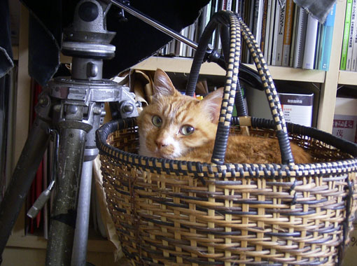 | さぁ、何がどうなっているんでしょう? 正解は「カゴにぴったり納まって眠っている鱈三」です。 このフィット具合がたまらん、と、カゴを移動させても目覚めず。 |