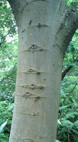 | エ→ヨ、ユ に変化しているケースが見られます。また、いぼいぼの木など樹皮の形状に着目した名前や、材がケヤキに似るため、「槻の木」という名もあります。モエノキというのは「燃えの木」のことで薪にして燃やしても煙が少なく目が痛くならないという特徴があります。また、材が腐ったときには綿のようにもわもわになってしまうので、それをホクチ(火口)に利用したことも燃えの木の語源と関係あるかも知れません。 | ||||||||||||||||