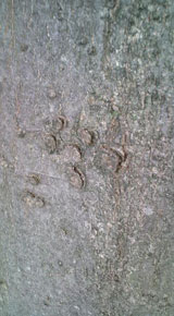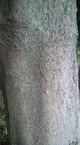 | エノキの樹皮(平成22年6月19日撮影) (左)まだ若木のため、枝の落ちた後が紡錘状に残る。表面は平滑 (中)大木になるといぼ状になりざらつく (右)ケヤキのように樹皮が鱗片状に剥がれてくる |