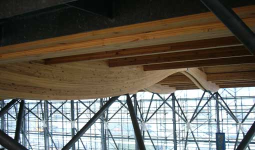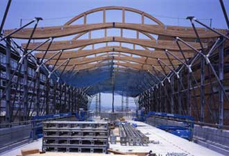 | 「柔くて、弱い」のが(正しくは南の地域の)杉の欠点である、ということが思い込みであるということにだんだん気がつき、自分のなかでは「欠点」から「特徴」という認識に方向転換をした。 工事中にしか見えない、間近から撮影した「変断面集成材」の写真がある。材積感があり、カーブと相まって女性的な印象を受ける。月刊『杉』の南雲さんの「デザインの色気」と題した文章のなかで、川口先生はこの構造に「構造の色気」を仕込んだ、という表現をされていた。同感です。 |