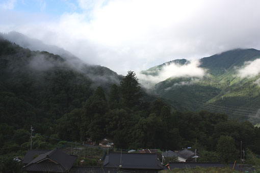 | 椎葉村十根川集落からの朝霧に煙る山々の風景。正面の大木は樹齢800年、樹高54mの「八村杉」 | |||||||||||||