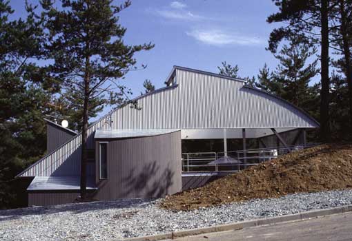 | 転機は1992年に長野県の小諸に住宅の設計をしたことからだった。山の中にある女性画家のアトリエ兼住宅である。山間部の地形にリンクした屋根型を持っていて、外壁の一部を地元産の杉材の縦羽目仕上げにした。しかし主役の外壁材はガルバリウム鋼板の波板であって、杉は背景的な扱いだった。恐る恐る手探りで使い始めたわけである。 | |||||||||||||