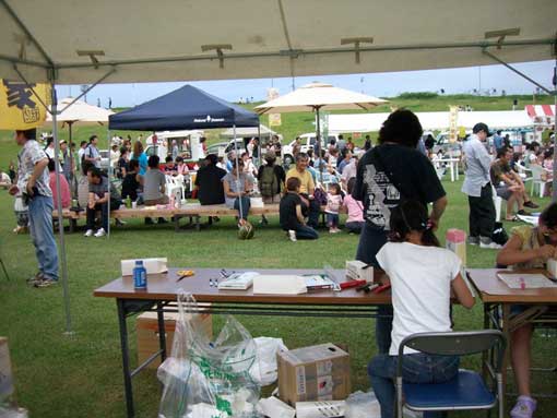 | リサイクル工作教室では、牛乳パックの灯ろうとペットボトル風車を作りました。奥に傘杉縁台が活躍中。 | ||||||||||||||||