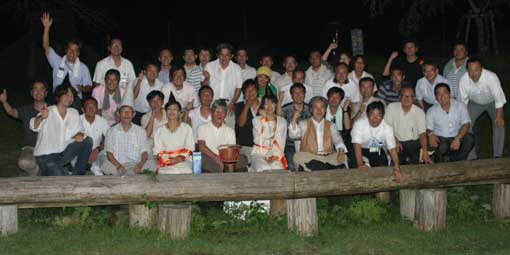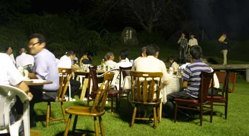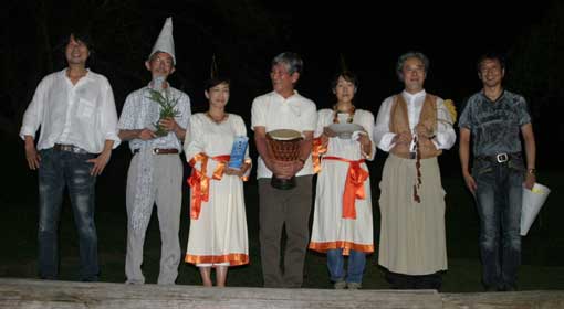 | 8月20日、「杉コレクション二次審査」を明日に控えたこの日、審査員の先生方を歓迎する意味合いでのレセプションを開きました。当日の朝は、大雨で、レセプションの会場が、古墳群そばの屋外バーベキュー会場「古代の風」であった為、心配されました雨が、正午に上がり、先生方を本場の会場である西都原古墳そして、西都夏祭り会場内で「杉コレ」を紹介する「杉コレ展示コーナー」を見て頂いてから、レセプションの時間となりました。 「レセプション」においては、多少不手際もありましたが、口蹄疫後の畜産復活をアピールする意味での宮崎牛豚肉、そして朝どれの魚介類でバーベキューを用意しました。 そして、我々の拙い芸を見て頂き、サプライズイベント、そして杉ダラの吉武さん達にも「神事?古代神事芸??」をやって頂き、会場は盛り上がったかと思います。 |